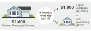 Say you have a budget of $1,600 for your monthly mortgage payment (principal and interest only). If interest rates rise just 1%, you’ll be paying nearly $1,800 per month for borrowing the same amount of money. Or if you want to stay at a budget of $1,600, it means you have to settle for a lower purchase price.
