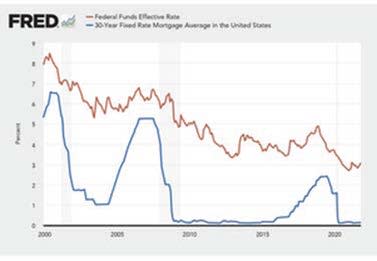 Here’s an example of how the fed funds rate and the 30-year fixed mortgage rate have differed over the past 20 years.