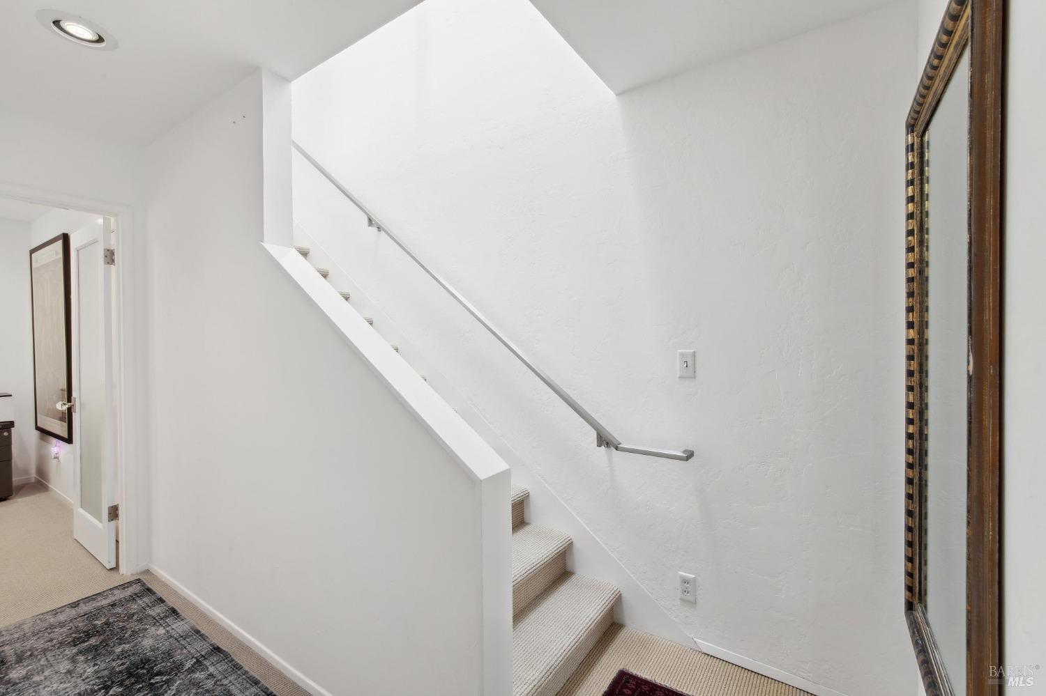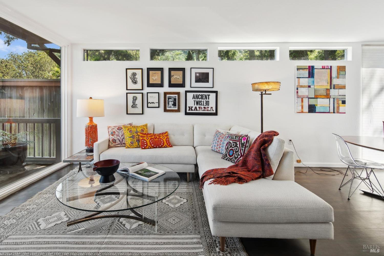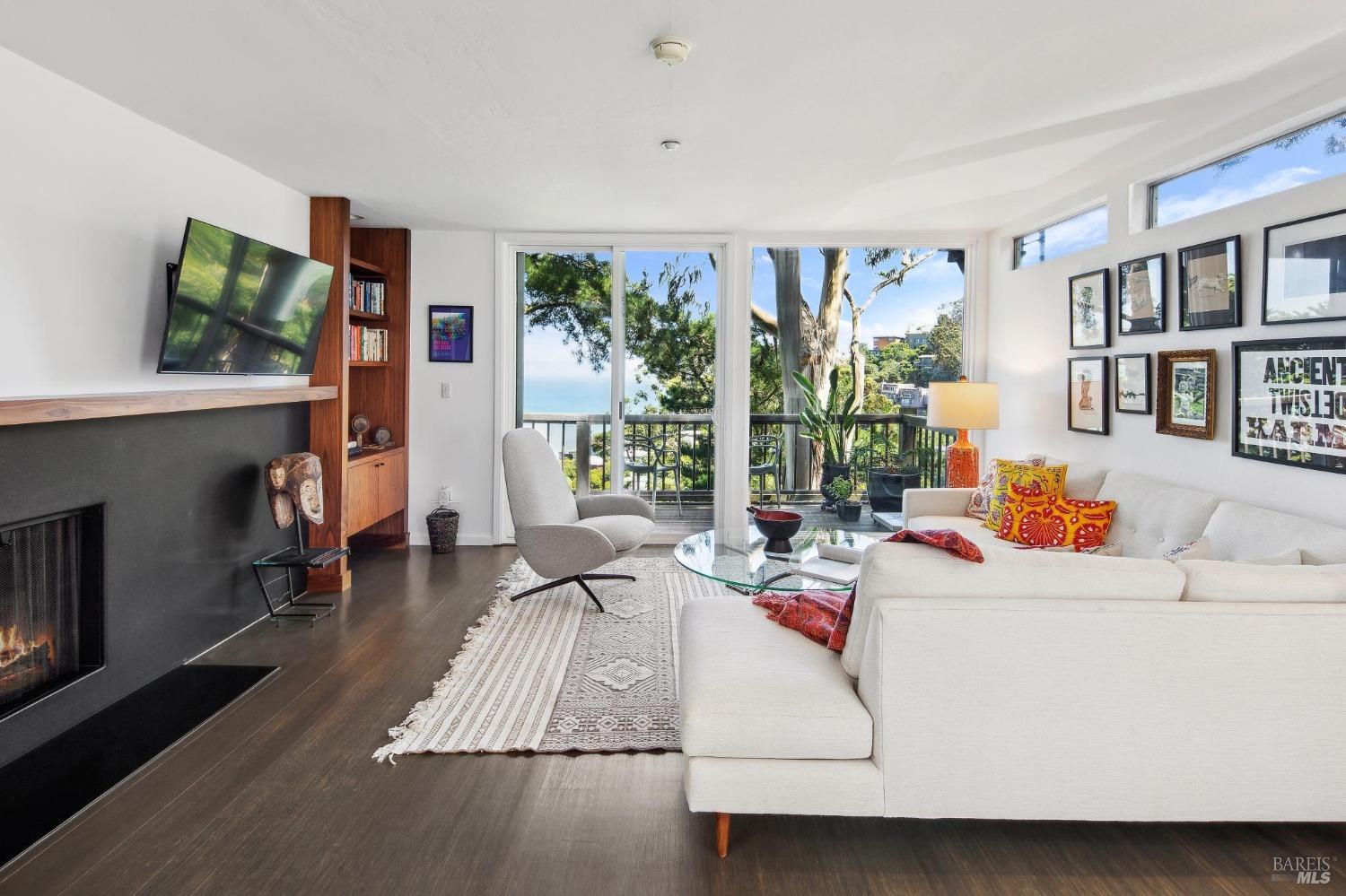 Chic and Secluded Townhouse with Stunning Bay and Angel Island views from the living room, primary, and expansive decks on both levels of this stylishly updated townhouse. The main level offers a no-stairs entry into an open-concept living room and kitchen, featuring a modern wood-burning fireplace and south-east facing natural light. Downstairs, the spacious primary includes a private deck, walk-in closet, and serene views. A second bedroom and full bath complete the lower level. (Another bath can be added.) Recent upgrades include new dual-pane windows and sliding glass doors, modern kitchen appliances, in-unit washer/dryer, on-trend carpeting, updated electrical, and an EV charger. The home also features a newer roof with skylights and a recently replaced furnace. With easy access to the GGNRA trails, an assigned side-by-side 2-car parking deck, only two units in the complex, and HOAs of $400/mo, this property offers all the conveniences and amenities of life in Sausalito and Marin with San Francisco just 10 minutes away. Great short-term rental income, too. (See City of Sausalito 30-day min. restrictions.) Don't miss this one!