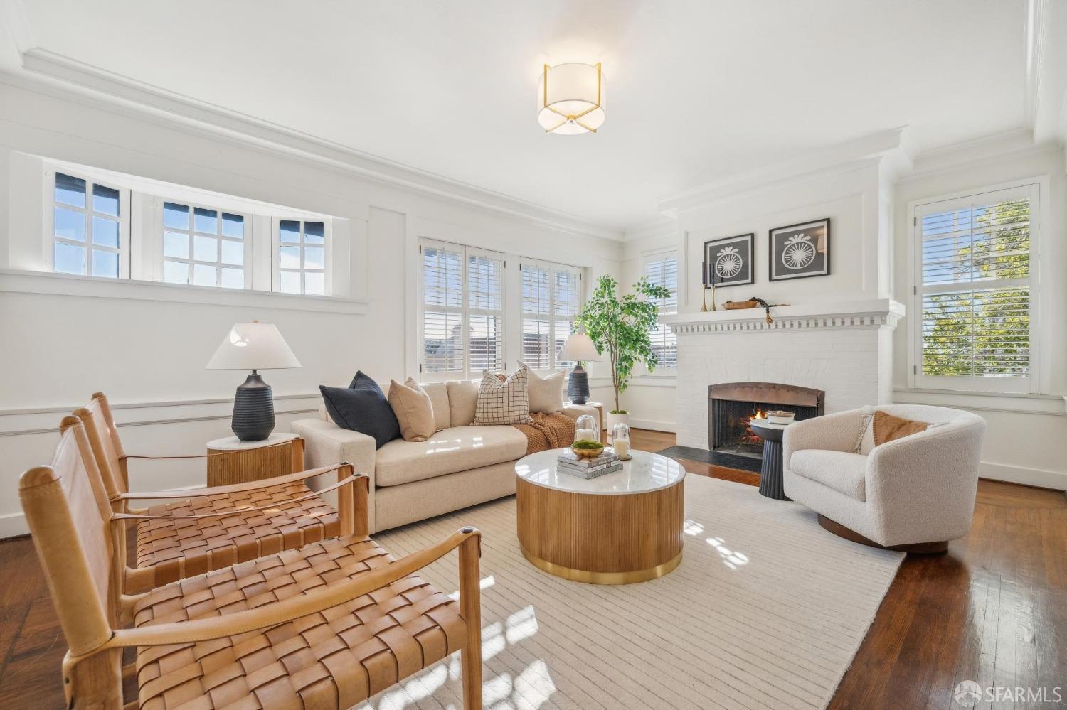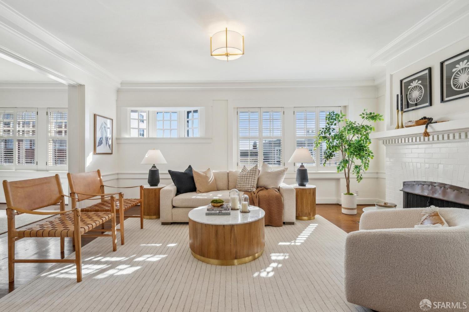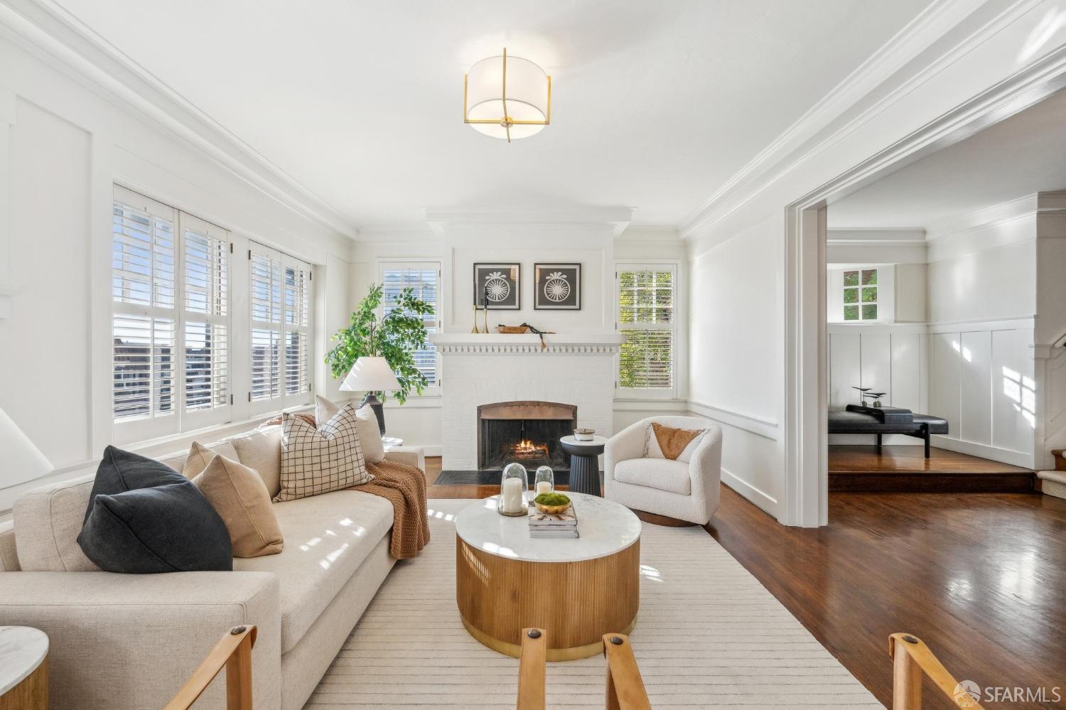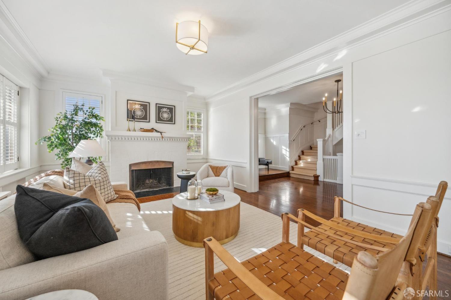 This stunning Craftsmanis located on the border of coveted Presidio and Pacific Heights. Featured in "Travel Home", this exquisite top-floor, two-level flat boasts timeless vintage details and south facing light w/ windows in every room. The spacious entry foyer sets the tone for the refined living experience. The main level includes a formal living room with a charming fireplace. Adjacent is a parlor with a granite-tiled designer wall and built-in cabinets for a separate office or media room. Entertain in style in the formal dining room, featuring elegant coffered ceilings, glass-paned French doors, and elegant wainscoting. The upgraded Chef's kitchen includes high-end appliances Carrera marble and zinc counters, an abundance of cabinets and storage, a butler pantry, custom lights, and a laundry area with bar sink and washer/dryer adding to the functionality and charm of the kitchen. Completing the main level are two spacious bedrooms and a split bath, offering comfort and privacy for family and guests alike. Upstairs is the ensuite primary retreat with a walk-in closet and City outlook. A walk-in attic space provides good storage. Nearby are parks, Sacramento Street, Laurel Village, cafes, restaurants, and shops. Clay is a Slow Street - 97 Walk Score and popular w/cyclists.