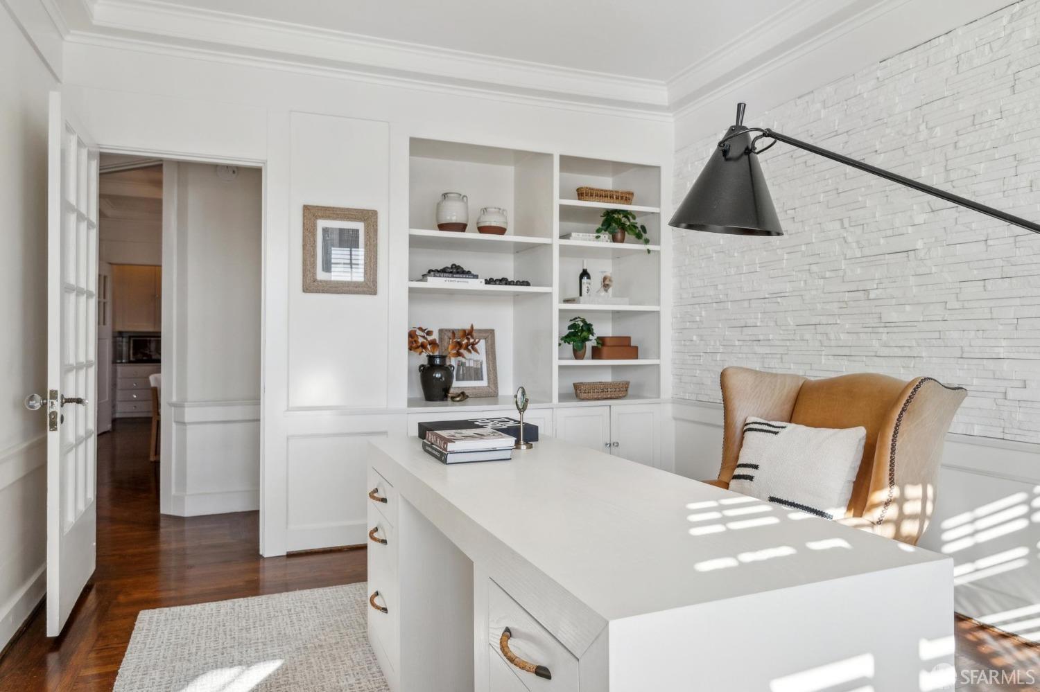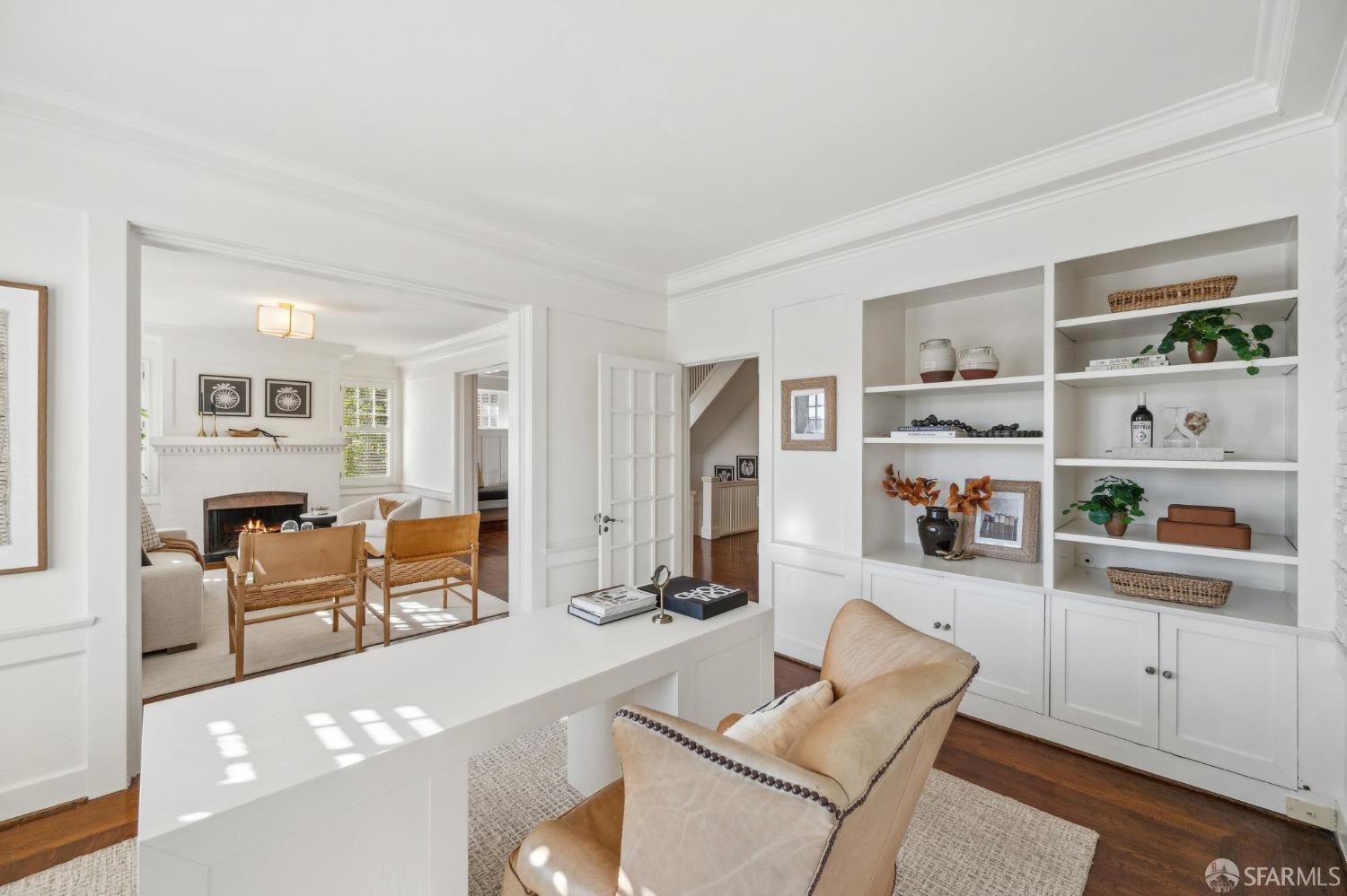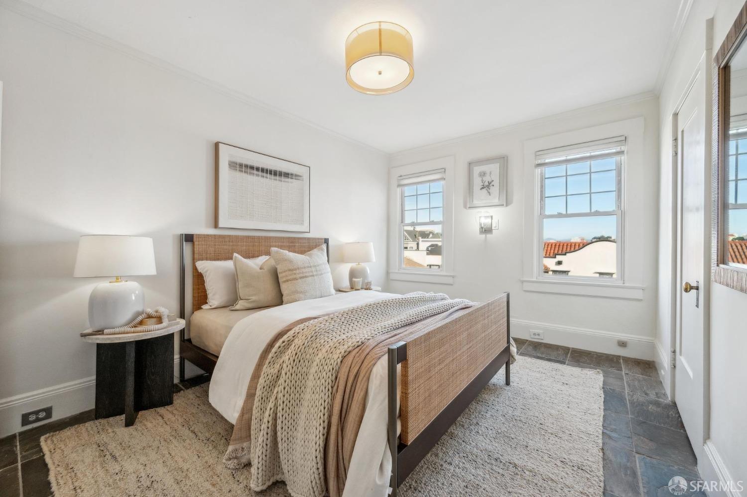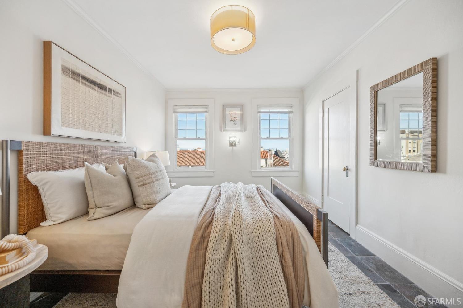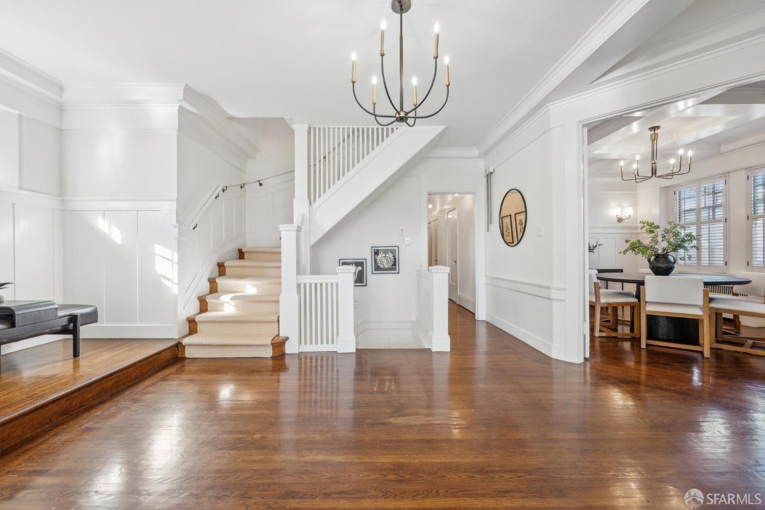 This stunning Craftsmanis located on the border of coveted Presidio and Pacific Heights. Featured in "Travel Home", this exquisite top-floor, two-level flat boasts timeless vintage details and south facing light w/ windows in every room. The spacious entry foyer sets the tone for the refined living experience. The main level includes a formal living room with a charming fireplace. Adjacent is a parlor with a granite-tiled designer wall and built-in cabinets for a separate office or media room. Entertain in style in the formal dining room, featuring elegant coffered ceilings, glass-paned French doors, and elegant wainscoting. The upgraded Chef's kitchen includes high-end appliances Carrera marble and zinc counters, an abundance of cabinets and storage, a butler pantry, custom lights, and a laundry area with bar sink and washer/dryer adding to the functionality and charm of the kitchen. Completing the main level are two spacious bedrooms and a split bath, offering comfort and privacy for family and guests alike. Upstairs is the ensuite primary retreat with a walk-in closet and City outlook. A walk-in attic space provides good storage. Nearby are parks, Sacramento Street, Laurel Village, cafes, restaurants, and shops. Clay is a Slow Street - 97 Walk Score and popular w/cyclists.