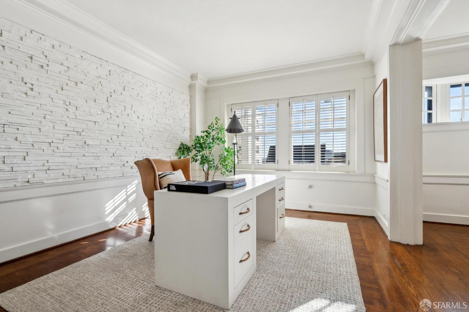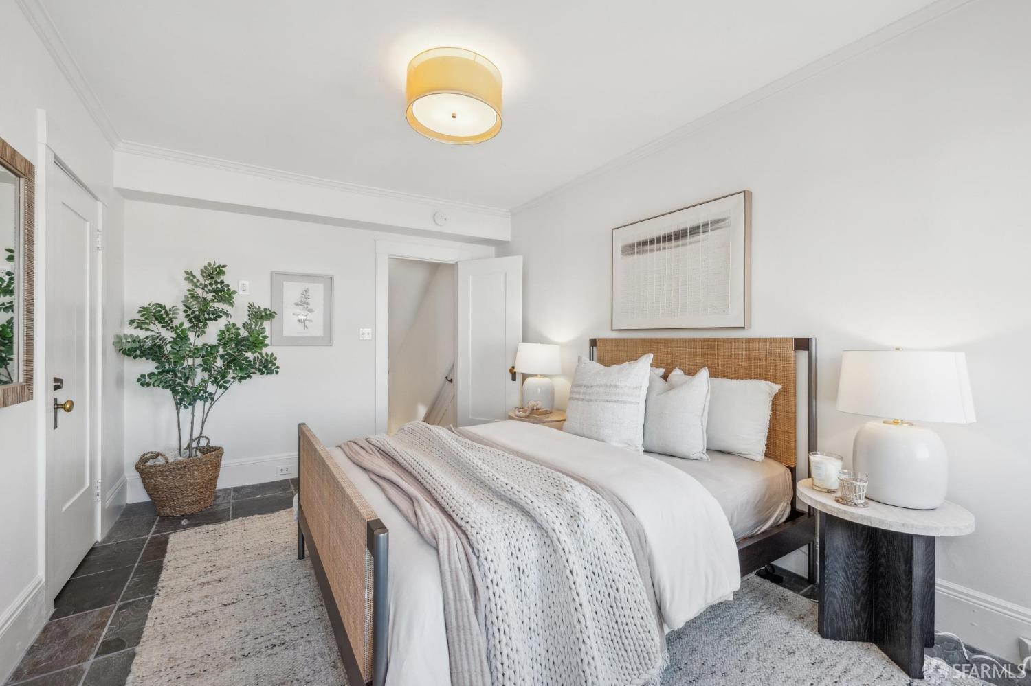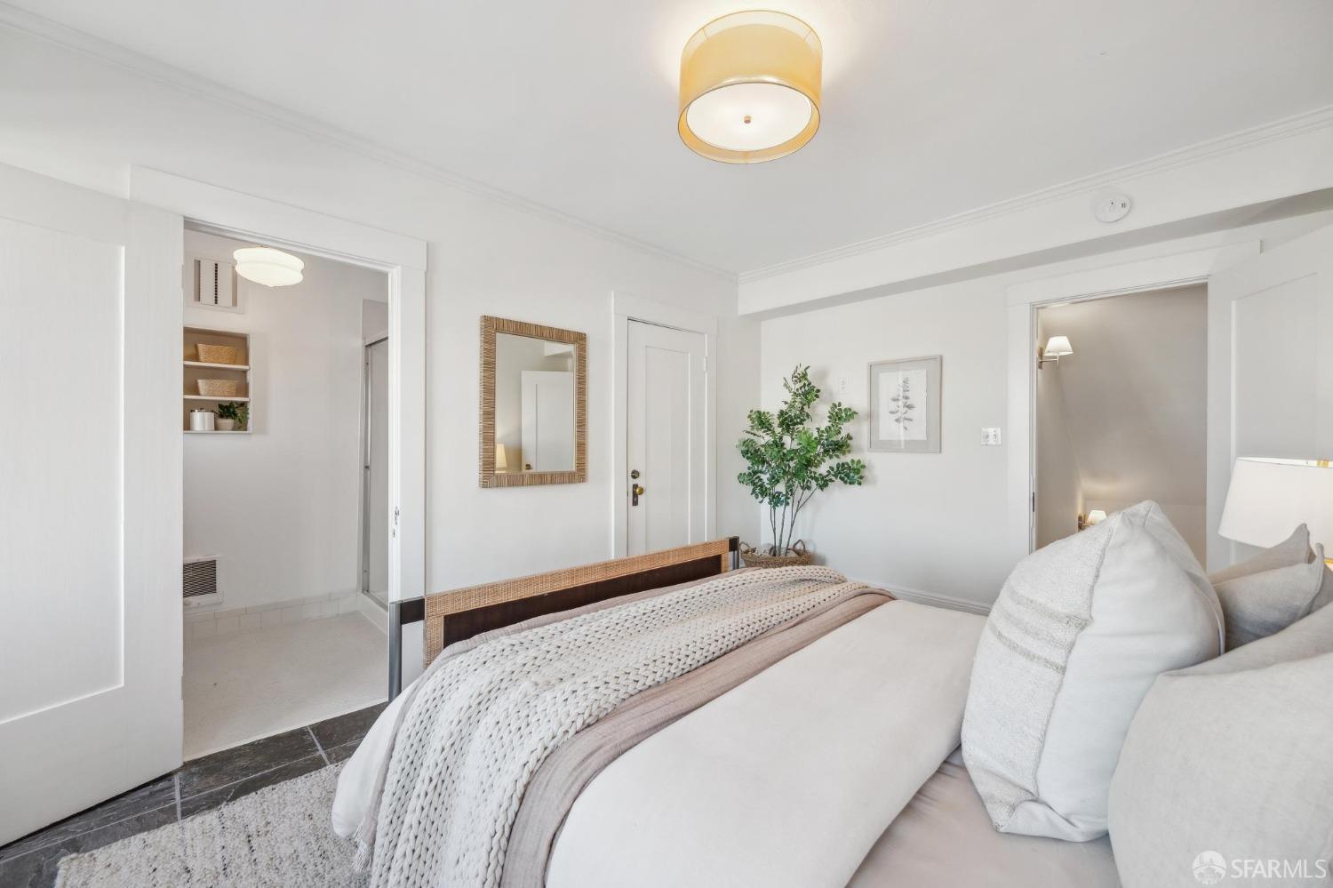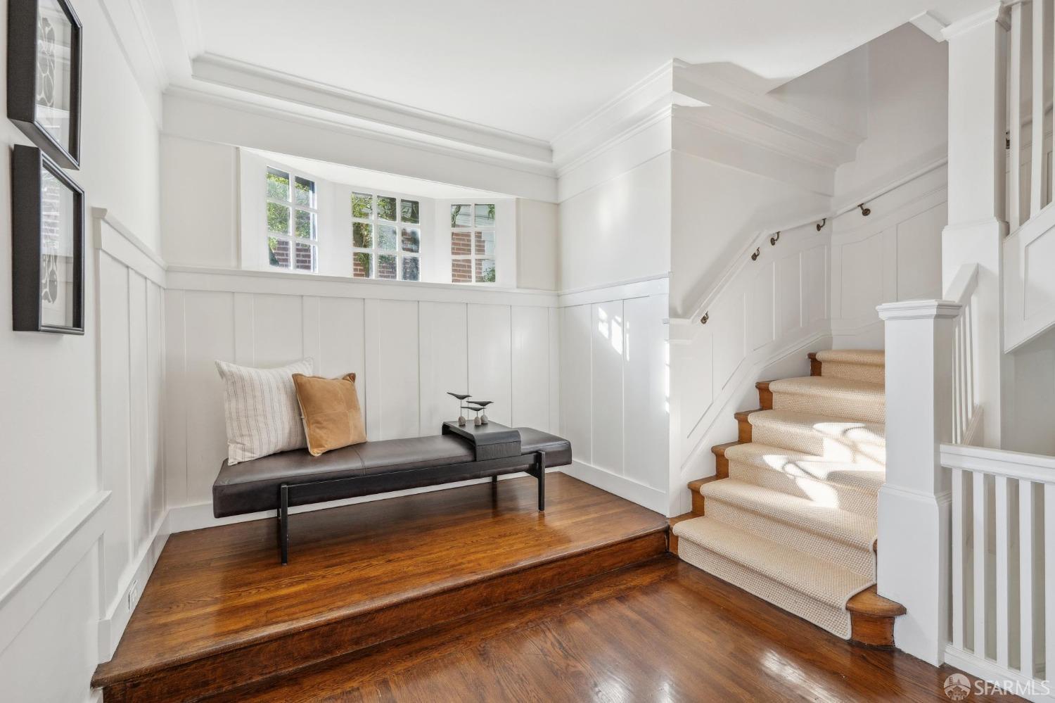 This stunning Craftsmanis located on the border of coveted Presidio and Pacific Heights. Featured in "Travel Home", this exquisite top-floor, two-level flat boasts timeless vintage details and south facing light w/ windows in every room. The spacious entry foyer sets the tone for the refined living experience. The main level includes a formal living room with a charming fireplace. Adjacent is a parlor with a granite-tiled designer wall and built-in cabinets for a separate office or media room. Entertain in style in the formal dining room, featuring elegant coffered ceilings, glass-paned French doors, and elegant wainscoting. The upgraded Chef's kitchen includes high-end appliances Carrera marble and zinc counters, an abundance of cabinets and storage, a butler pantry, custom lights, and a laundry area with bar sink and washer/dryer adding to the functionality and charm of the kitchen. Completing the main level are two spacious bedrooms and a split bath, offering comfort and privacy for family and guests alike. Upstairs is the ensuite primary retreat with a walk-in closet and City outlook. A walk-in attic space provides good storage. Nearby are parks, Sacramento Street, Laurel Village, cafes, restaurants, and shops. Clay is a Slow Street - 97 Walk Score and popular w/cyclists.
